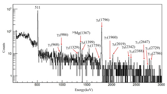 Figure 4 shows the spectrum coincided with particles in the decay of P. Fifteen peaks were identified, of which 13 labeled – are directly related to the decay of P. The total uncertainty was associated with the fitting uncertainty and the calibration of detectors. Statistically, the significant peak in the spectrum is the well-known 511 keV ray originated from the positron–electron annihilation. The 1367 keV ray is assigned as the deexcitation from the first excited state to the ground state of Mg. The detailed information of the -delayed -ray transitions are listed in Table 2.