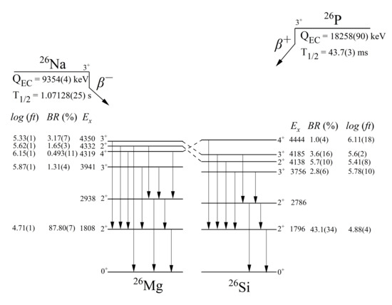 - Basunia, M.S.; Hurst, A.M. Nuclear Data Sheets for A = 26. Nucl. Data Sheets 2016, 134, 1–148. [Google Scholar] [CrossRef]