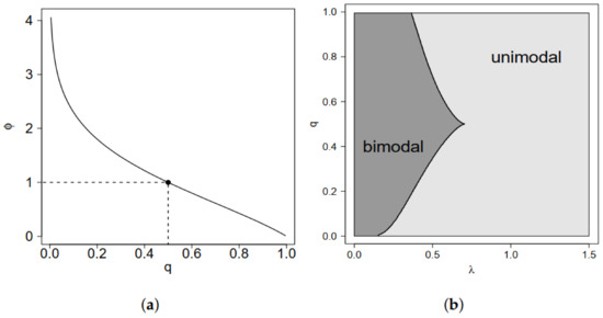 (a) Relation between q and and (b) regions of unimodality and bimodality for the GSC model in terms of q and .