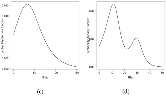 Finally, Figure 3 shows the different estimated pdf values for the Bfat under different scenarios for bmi and lbm. We note that these estimated pdf values assumed different shapes—unimodal, bimodal symmetric, and bimodal asymmetric—justifying the use of the double regression GSC model in this example. Finally, Figure 4 shows the pairs for the five quantiles modeled, identifying the unimodal and bimodal cases.