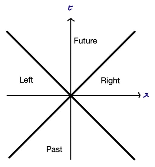 Light-like lines through the origin partition spacetime into four distinct regions. The partition exists on all scales. Throughout this article all diagrams assume natural units in which .