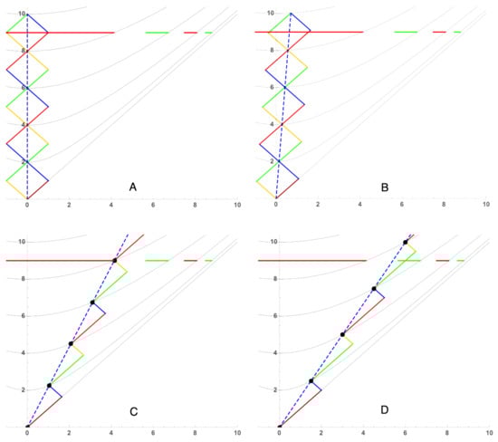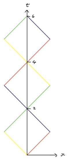The third point suggests why complex numbers are so convenient in quantum mechanics and why Minkowski’s original formulation of special relativity invoked the ‘time’ coordinate . Looking at Figure 2 or Figure 3, the colour designations are all period 4. At any spatial location, each colour returns after four switches and the colours stay in sequence. As a clock, the timestamp completes its cycle in four steps along the time axis. However, in terms of spatial displacement, the spatial ‘clock’ returns to the spatial origin every two steps. At each return the colours have switched to their complement giving the encoding Equation (8). Note that the initial colours in this discrete representation switch via the real matrix