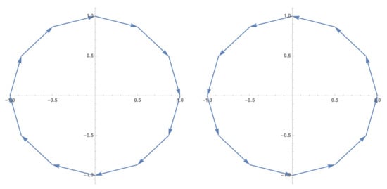 We see here that the digital clock that initially ticked between the four colours encoded via Equation (3) using the switch matrix , has been interpolated by mapping intermediate states onto the unit circle in the complex plane. Instead of there being a single step that is itself a switch (i.e., ), the refinement below the Compton scale replaces the switch with successively smaller rotations.