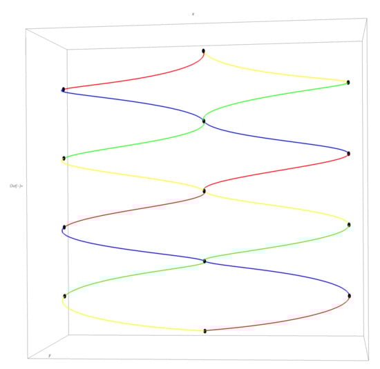 Visually, we saw that digital versions of Figure 2 could be created using transfer matrices like Equation (7) and then refined by increasing the size of the transfer matrix appropriately. If we wanted to preserve the timestamp structure while making the scaling smooth, the resulting smoothed ‘image’ looked like Figure 6. That is, the two halves of the planar timestamp had been mapped onto osculating helices. In the context of images, the relationships between scale, colour and geometry were easy to see because of the context of encoding images of spacetime diagrams. That is, the reason for the mathematics was always known through what it encoded.