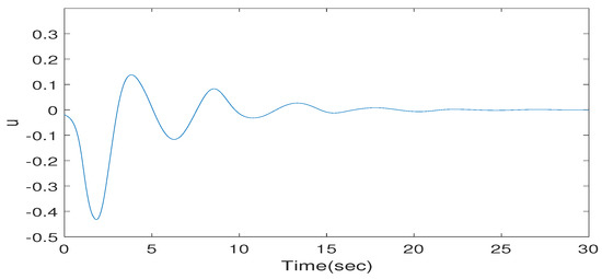 Figure 1, Figure 2, Figure 3, Figure 4, Figure 5 and Figure 6 show the simulation results. Figure 1 presents the system state from which it can be seen that the asymptotic regulation is achieved. The input signal u is presented in Figure 2. The adaptive update laws of , , and , are shown in Figure 3 and Figure 4, respectively. The curves of filter parameters and are displayed in Figure 5 and Figure 6 presents the compensation system state . According to the simulation results, we can ensure that the objective of this paper is achieved.