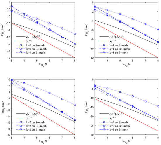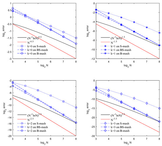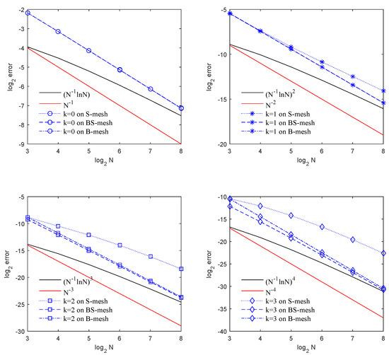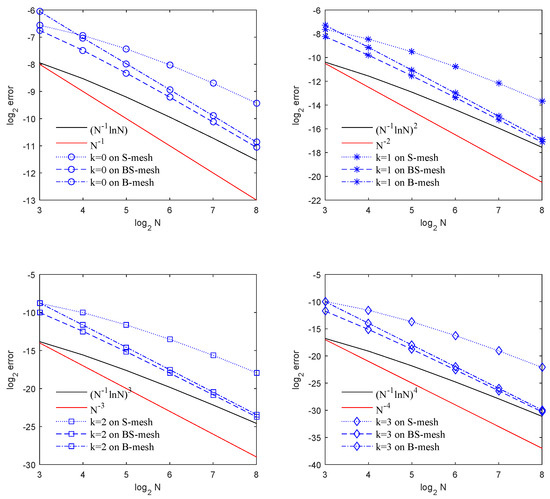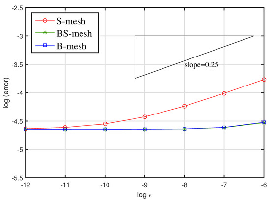 Moreover, we test the dependence of these two types of errors on ε. We observe that the errors in the balanced norm are almost constant, whereas the errors in the energy norm change slightly. In Figure 7, we confirm the influence of the factor on the energy norm errors obtained for the three layer-adapted meshes. Note that for this example, the -factor is clearly observed on both the S-type and B-type meshes. This may be due to the fact that the regular part of the exact solution belongs to , as described in [10] (Theorem 3.5).