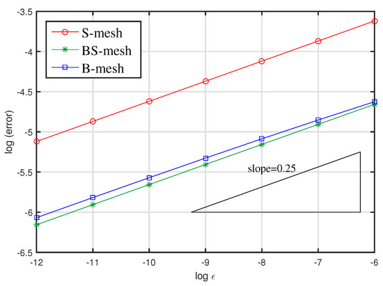 We show the relevance of these errors to the small parameter ε. We let , , and vary the values of ε. We see that the errors in the balanced norm are almost unchanged, whereas the errors in the energy norm change slightly. For a visual understanding, we plot the energy errors via ε on log–log coordinates. In Figure 4, we observe the subtle influence of the -factor on the energy errors; the results agree with our predictions.