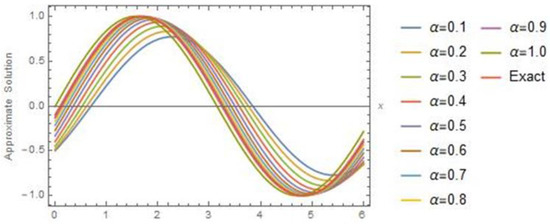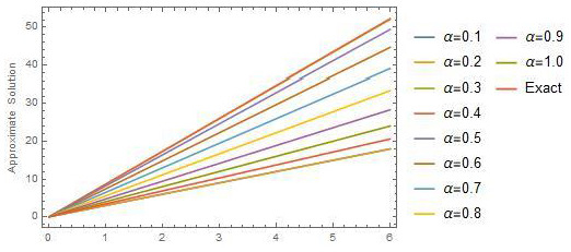 The exact solution to this problem is when . The New NAM is applied, and the exact solution appears in the first few iterations. Two-dimensional and three-dimensional plots of the Exact Solution and Approximate Solution using of NAM in domain at different time are shown in Figure 7 and Figure 8 respectively. By using proposed technique three-dimensional plots of Approximate Solutions between and for different values of α are shown in Figure 9. Comparison between Exact Solution and Approximate Solution at different domain values of at time by using NAM is shown in Table 3.