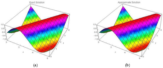 Three-dimensional plots of the (a) Exact Solution and (b) Approximate Solution using NAM for of Example 4.