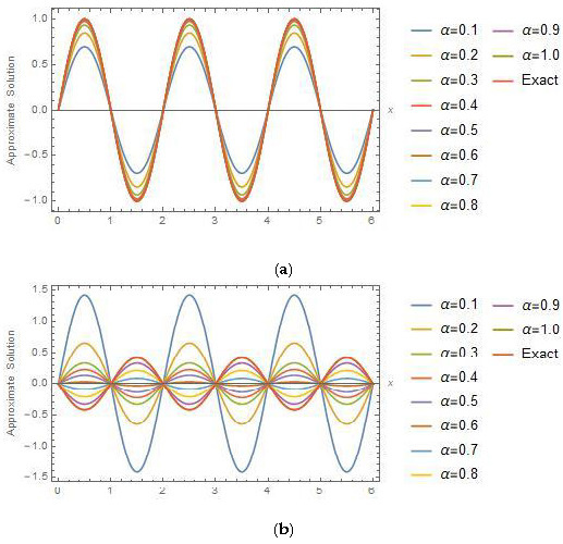 Figure 1 shows two-dimensional plot of the Exact Solution and Approximate Solution using of NAM in domain at time . Figure 2 shows three-dimensional plots of Exact Solution and Approximate Solutions by using proposed technique. Three-dimensional plots of Approximate Solution using NAM between and for different values of α are shown in Figure 3. Comparison between Exact Solution and Approximate Solution at different values of at time by using NAM is shown in Table 1.
