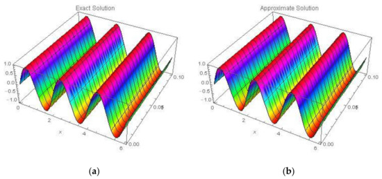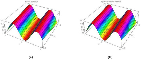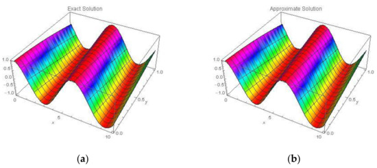 The exact solution of this problem is when . Table 4 shows a comparison between Exact Solution and Approximate Solution at different values of at and by using NAM. Two-dimensional plots of the Exact Solution and Approximate Solution using of NAM in domain and at times and are shown in Figure 10. By using proposed technique three-dimensional plots of Approximate Solutions between and different values of are shown in Figure 11 and Figure 12 respectively.