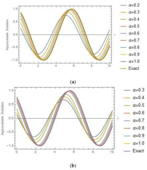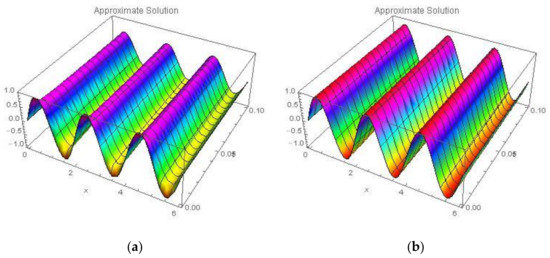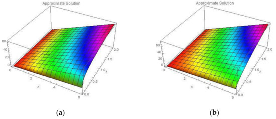 Three-dimensional plots of Approximate Solution using NAM between and for (a) α = 0.3 and (b) of Example 1.
