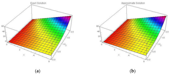Three-dimensional plots of the (a) Exact Solution and (b) Approximate Solution using NAM for Example 2.