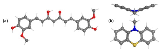 (a) The enol tautomer of curcumin C1; (b) the butterfly conformation of phenothiazine.