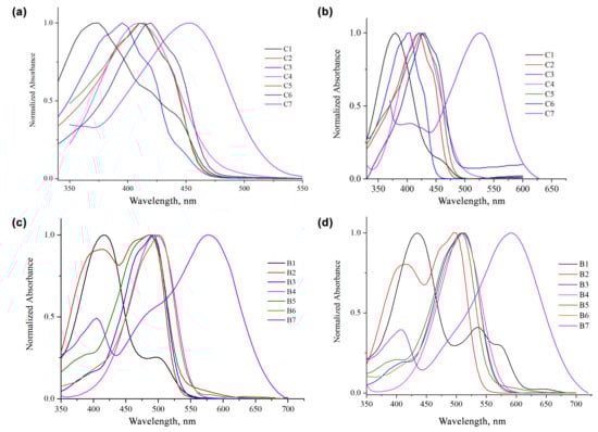 Normalized absorption spectra of compounds C1–C7 at room temperature in acetone (a) and in DMSO (b); normalized absorption spectra of compounds B1–B7 in acetone (c) and in DMSO (d) (at ~10−5 M).