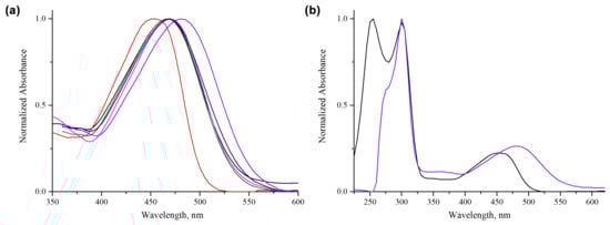 (a) Normalized absorption spectra of compound C7 in seven different solvents at room temperature: acetone (black), hexane (red), tetrahydrofuran (blue), dichloromethane (pink), acetonitrile (green), ethanol (dark blue), dimethyl sulfoxide (purple); (b) full absorption spectra of compound C7 hexane (red) and dimethyl sulfoxide (purple) at room temperature (~10−5 M).
