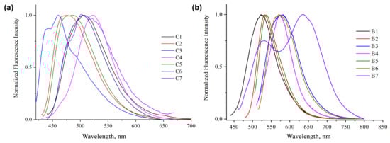 Normalized emission spectra of compounds C1–C7 (a) and B1–B7 (b) in acetone at room temperature.