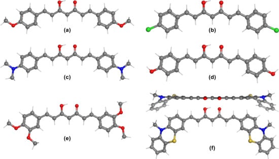 DFT optimized ground state geometries of the enol tautomer of curcumin analogues at the B3LYP/6-311 + G (d,p) level of theory in acetone using the PCM solvation model: (a) C2−CS, (b) C3−CS, (c) C4−C1, (d) C5−CS, (e) C6−CS, (f) C7−C1 (top and side view).