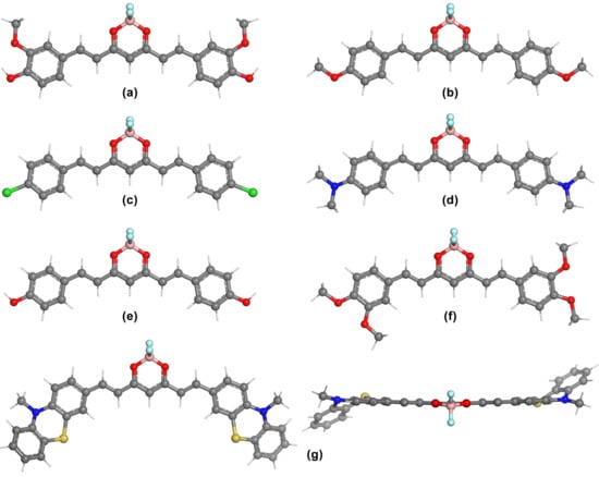DFT optimized ground state geometries of the borondifluoride complexes at the B3LYP/6-311 + G (d,p) level of theory in acetone using the PCM solvation model: (a) B1−CS, (b) B2−CS, (c) B3−CS, (d) B4−CS, (e) B5−CS, (f) B6−C1, (g) B7−C1 (side and top view).
