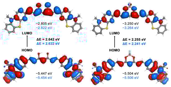 In the case of molecules C7 and B7, the acceptor-donor-acceptor electronic structure of these π-conjugated molecules is highlighted by the plots of the frontier molecular orbitals. It can be observed in Figure 7, that the HOMO orbitals are localized mainly on the terminal phenothiazine units, which acts as an electron donor group, whereas the LUMO orbitals are located on the electron acceptor core of the molecule, which in case of the BF2 complex is the dioxaborine ring. The frontier molecular orbital diagrams of compounds C1–C6 (Figure S41) and B1–B6 (Figure S42), computed in acetone by B3LYP/6-311 + G (d,p), indicated a similar distribution of the HOMO and LUMO orbitals.