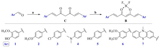 Synthesis of curcumin analogues and the corresponding BF2 complexes: (a) 2 equiv. aromatic aldehyde, acetylacetone, B2O3, i-PrNH2, B(Oi-Pr)3, EtOAc, (C1–C7); (b) BF3·Et2O, (CH3CO)2O, Et2O, −5 °C, 24 h (B1–B7).