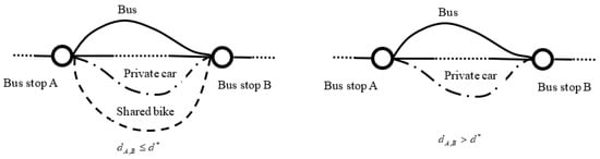 - Travel modes. There are three optional travel modes among bus stops: (1) buses, (2) private car, and (3) shared bike. In the ring bus lines, travelers can travel between any two bus stops without changing lines, and they always choose the shortest path (in a ring bus line, there are clockwise and counterclockwise paths from bus stop i to bus stop j). Let d* denote the critical distance of bicycle riding; when the distance between OD is larger than d*, travelers will not choose to ride a bicycle (Figure 1).Figure 1. Travel modes between bus stops.