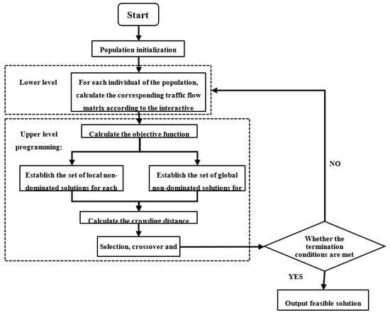It is worth mentioning that Equations (24)–(26) constitute a multi-objective bi-level programming problem in which the problem forms the upper-level programming and the problem represents the lower-level programming. The multi-objective bi-level programming model can be represented as