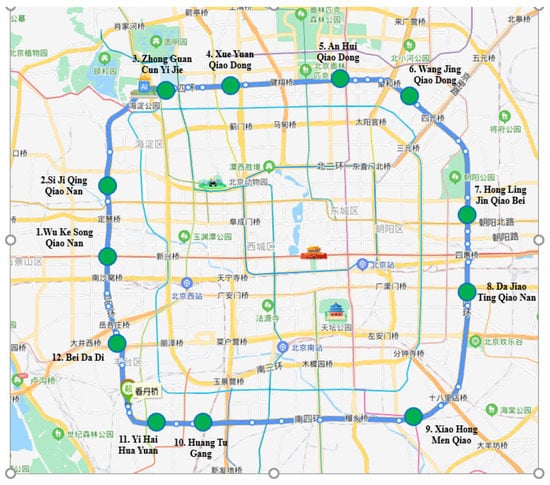 In recent years, with the continuous increase of the scale of big cities, the road network of many large cities presents a ring structure spreading from the center to the periphery. From the perspective of urban planning, in cities with high population density, the ring road plays an important role in alleviating congestion in urban centers and realizing rapid connectivity between urban areas []. The ring road traffic congestion index should show the characteristics of gradually decreasing from the core area to the periphery, and according to the Beijing Transportation Development Annual Report 2021, the traffic congestion index in Beijing has decreased under the COVID-19 virus situation; however, congestion still occurs frequently in some ring roads. For example, during the rush hour of public transportation, there has been a long period of congestion between Ciyunsi bridge and Dajiaoting bridge on the middle east fourth ring road, which indicates that the bus line operation on the ring road needs to be further optimized.