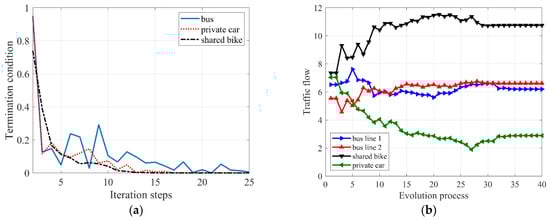 Table 3 illustrates the parameter setting of the model, in which the value of and are determined on the basis of the literature [], the fare range of bus per kilometer and parking fee are determined on the basis of the mean value of real price in Beijing and the value range is appropriately expanded, and the average departure frequency of a bus line is determined by recording the departure frequency at the important bus stop. It is difficult for travelers to remember their travel experience every day in the past, and thus we set the value of to 10 and set the value of to 100 to ensure that the evolution results of BM model can converge in limited iteration time. By summarizing the relevant literature [], we found that when the average travel distance is less than 5 km, there will be a demand for shared bike; thus, we set .