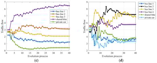 Here, represents the average choice proportion of a travel mode when travelers’ behavior is in equilibrium; therefore, the adjustment of bus lines and travelers’ group behavior can change the social equilibrium. On the basis of the representative Pareto optimal solution, we analyzed the proportion of travel mode choice according to Equation (34) and investigated the impact of optimal bus lines and differentiated fares on the equilibrium.