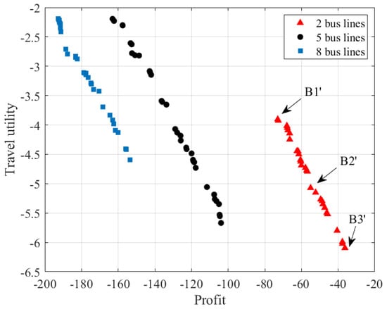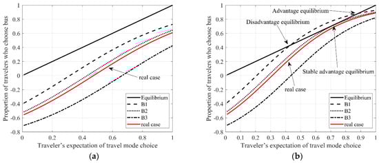Figure 8a shows the relationship between subjective expectation curves (based on Equation (34)) of different bus line schemes (Pareto optimal solutions and the bus lines and ticket fares under real case, ) and travelers’ group selection equilibrium under the multi-agent BM reinforcement learning model. It can be seen that, when , neither Pareto optimal solution nor bus lines and ticket fares under real case can make travelers’ subjective expectation and actual decision reach equilibrium; however, compared with the bus lines and ticket fares under real case, the model proposed in this paper produces Pareto optimal solutions that make the subjective expectation curve closer to equilibrium (B1 and B2). Moreover, it can be seen from Figure 8b that, when , the Pareto optimal solution B2 reaches unique equilibrium; in this equilibrium state, the proportion of travelers who choose bus is greater than 0.5, and the Pareto optimal solution B1 produces two equilibrium points, namely, advantage equilibrium point (the proportion of travelers who choose bus is greater than 0.5) and disadvantage equilibrium point (the proportion of travelers who choose bus is less than 0.5). Therefore, Figure 8a,b shows that the complexity of travelers’ group behavior will significantly shift the social equilibrium equation, and the increase of social interaction intensity makes the subjective expectation curve move to the upper left. For the management department of buses, different bus line and fare plans (from B1 to B3) will also significantly shift the social equilibrium equation, and thus the management department of buses can appropriately increase the dissemination of accurate travel cost information among travelers to promote the formation of equilibrium.