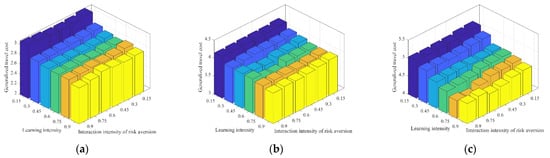 Figure 7 illustrates the effect of traveler’s learning behavior (travelers’ learning intensity and traveler’s interaction intensity of risk aversion ) on generalized travel cost, wherein it can be seen that the generalized travel cost corresponding to the representative Pareto optimal solution decreases with the increase of and . This result indicates that travelers’ reinforcement learning and information exchanging on risk aversion level in the multi-objective bi-level programming are effective; therefore, increasing the dissemination of travel cost information and risk attitude among travelers can effectively reduce travel costs.