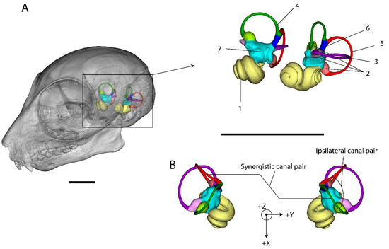 - Spoor, F.; Garland, T.; Krovitz, G.; Ryan, T.M.; Silcox, M.T.; Walker, A. The Primate Semicircular Canal System and Locomotion. Proc. Natl. Acad. Sci. USA 2007, 104, 10808–10812. [Google Scholar] [CrossRef] [Green Version]