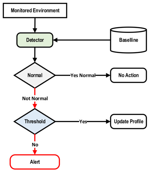 Anomaly-based IDS detect misuse in the cloud environment or penetrations and classify them into normal and abnormal user behavior through a system that collects all the information on normal user behavior or action over a period of time. Then, a statistical test is performed to check whether a suspected behavior is linked to a normal user’s behavior or not. Figure 1 presents the general architecture of anomaly-based IDS. The difficulty in maintaining this type of IDS is that it cannot be updated without losing the data that the previous system was trained on. Also, the accuracy of identification is low, which gives a high number of false positives for this type of system. Anomaly-based IDS has been addressed by several researchers as follows.
