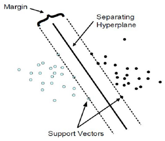where γ, r and d are kernel parameters. The concepts of the margin, separation hyperplane, and support vector are illustrated in Figure 4.