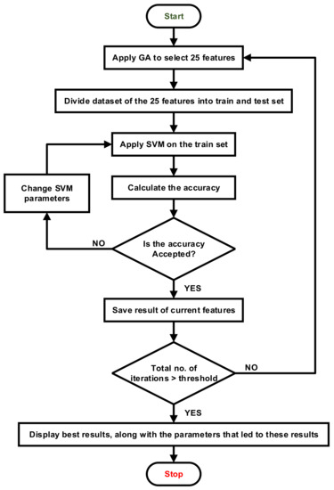 | 1: Apply Algorithm 1 to select features. 2: loop 3: Create initial generation. 4: for i=1 to n /*n is the number of folds*/ 5: Select 1/n of the population as a test set and (n−1)/n for training. 6: Apply SVM to the current training set with specific hyperparameters. 7: Evaluate the performance of the results using the fitness function. 8: end for 9: performance of the current generation= average score of the results of n folds 10: Save the results of step 6. 11: until the stop criteria are met. 12: Display the best result, along with the hyperparameters for the SVM that produced it. |