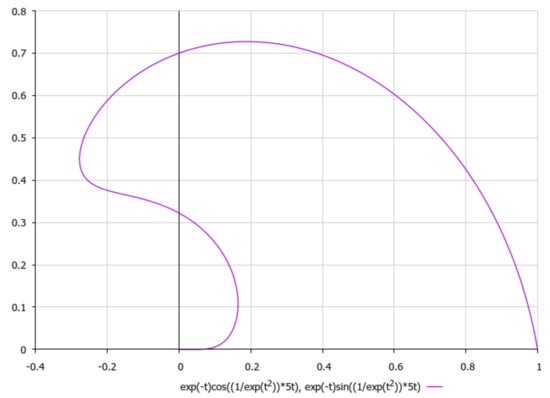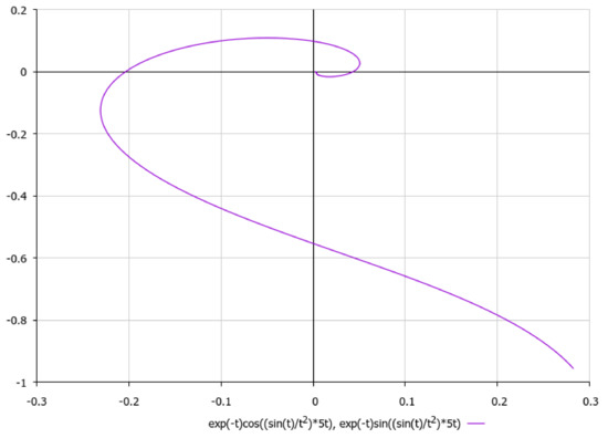 It is worth noting, with respect to presenting the asymptotics of non-stationary three-dimensional solutions of external non-viscous rotational flow (5), that we should obtain under aforementioned simplifying assumption γ2 >> σ2, that if we choose, e.g., , it would yield a 2D logarithmic spiral (here {α,β} are positive constants) for which third component of velocity field could be considered as to be approximately constant with respect to the time-parameter t. Let us schematically imagine at Figure 13, Figure 14, Figure 15, Figure 16 and Figure 17, the appropriate graphical plots of velocity field (5) (asymptotics of external rotational flow, z = 5), which demonstrate extremely nonlinear dynamics.