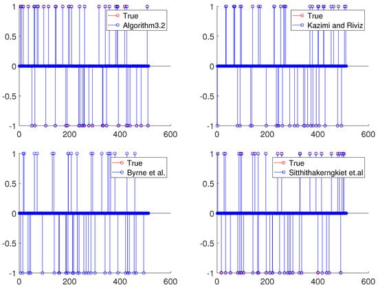 During the operation, is generated randomly with , , is K-spikes with amplitude distributed throughout the region randomly. In addition, the signal to noise ratio (SNR) is chosen as , in two algorithms and in Algorithm 2. The recovery simulation results are illustrated in Figure 4.