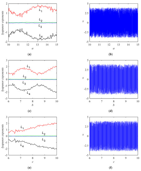 Lyapunov exponent spectrum and bifurcation diagrams of system (1). (a) Lyapunov exponents versus a with b = c = 8 and (x0, y0, z0, w0) = (2, 2, 2, 2). (b) Bifurcation of x versus a with b = c = 8 and (x0, y0, z0, w0) = (2, 2, 2, 2). (c) Lyapunov exponents versus b with a = 12, c = 8 and (x0, y0, z0, w0) = (2, 2, 2, 2). (d) Bifurcation of x versus b with a = 12, c = 8 and (x0, y0, z0, w0) = (2, 2, 2, 2). (e) Lyapunov exponents versus c with a = 12, b = 8 and (x0, y0, z0, w0) = (2, 2, 2, 2). (f) Bifurcation of x versus c with a = 12, b = 8 and (x0, y0, z0, w0) = (2, 2, 2, 2).