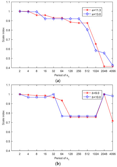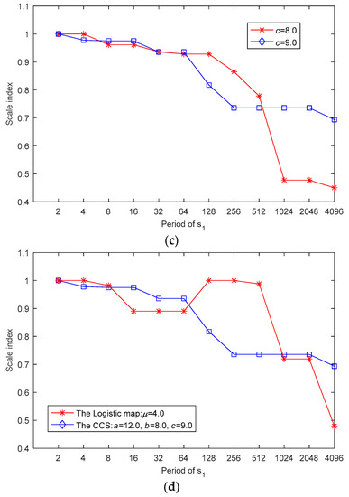 In addition, there are some other methods that can be used to test the complexity of chaotic time series. For example, in [44], the authors adopted the scale index which is presented by Benítez et al. [45] to detect and study non-periodicity in the chaotic sequences. The scale index technique is based on the continuous wavelet transform and multi-resolution analysis technology. Here, the computations are performed using the R statistical software named wavScalogram developed by Vicente J. Bolós et al. [46], which provides a convenient means for researchers to identify the aperiodic features of time series.. Starting with the initial condition (x0, y0, z0, w0) = [2, 2, 2, 2]T, we iterate the system (1) 4595 times with the time step Δt = 0.01, obtain four sequences of {x1, x2, x3, x4} each with a length of 4596. Discard the first 500 values for each sequence, then synthesize them into a sequence x = [x1, x2, x3, x4] with a length of 16,384, and then convert the synthesized sequence into an integer sequence Intx = mod(floor(x × 1012), 256). Then, calculate the scale index values of the sequence Intx. Some representative results are shown in Figure 3. Comparing Figure 2a and Figure 3a, we find that when a changes from 11.3 to 13, the scale index at the largest scale 4096 increases from 0.4146713 to 0.4257676, which is consistent with the increase in Lyapunov exponent in Figure 2a. Comparing Figure 2b and Figure 3b, we find that when b changes from 9 to 10, the scale index at the largest scale 4096 increases from 0.7163966 to 0.9804939, which is consistent with the increase in Lyapunov exponent in Figure 2b. Comparing Figure 2c and Figure 3c, we find that when c changes from 8 to 9, the scale index at the largest scale 4096 increases from 0.4502245 to 0.6935807, which is consistent with the increase of Lyapunov exponent in Figure 2c. Figure 3d shows the scale index of the sequences generated by the famous chaotic logistic map and the proposed CCS, we find that the scale index at the largest scale 4096 of the proposed CCS is larger than that of the logistic map.