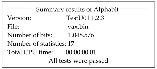 In the Alphabit test, we adopted 1,048,576 bits from the binary file to test. The results are shown in Table 4, which confirmed that all tests were passed with a p-value in the range of [0.001, 0.9990].