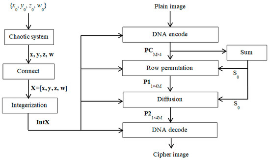 DNA (deoxyribonucleic acid) computing is a new generation of computing technology that uses biochemical reaction technology to use biological DNA molecules as information carriers instead of standard artificial hardware for computing. Compared with traditional computing, DNA computing has some potential advantages, such as huge storage space, massive parallelism, and ultra-low power consumption [15], therefore, it has attracted the attention of many researchers in different fields such as mathematics, biology, and computer science [16,17]. Among them, some researchers have introduced the concept of DNA computing into cryptography and used its calculation rules as part of the encryption algorithm. The subject of studying such kinds of encryption algorithms is called DNA cryptography [18]. The introduction of DNA encoding schemes into the field of image encryption is based on the method of processing information in biological sciences [19,20,21]. Using the DNA coding scheme to process digital images, the pixel position and pixel value of the image can be changed at the same time to achieve a good encryption effect [22,23]. Combining the chaotic system to realize the random and dynamic change of the DNA coding rules is an effective means to better the security of the encryption system. At present, many image encryption algorithms based on DNA encoding have been proposed [24,25,26,27]. In [28], Zhang et al. proposed a novel image fusion encryption algorithm based on DNA sequence operation and hyper-chaotic system. In 2015, Song et al. [29] proposed an image encryption algorithm based on DNA encoding and spatiotemporal chaos (IEA-DESC). In [30], Wang et al. proposed a novel and effective image encryption algorithm based on chaos and DNA encoding. In [31], Hu et al. proposed an image encryption scheme combining chaos with cycle operation for DNA sequences, in the scheme, the DNA coding rule was controlled by a keystream produced from Chen’s hyper-chaotic system. In [32], Yong Zhang proposed an image encryption algorithm based on chaos and DNA computing. He proved that the DNA of the image represented the existence of 24 DNA coding rules and proposed a new DNA connection operation. Recently, Yan et al. [33] proposed a chaos-based image encryption algorithm by using an arithmetic sequence scrambling model and DNA coding. However, some methods have been proven to have serious defects and are vulnerable to chosen-plaintext attacks. For example, the encryption algorithm proposed in [29] was broken by Wen et al. [34] using a chosen-plaintext attack and a chosen-ciphertext attack, respectively. The encryption algorithm proposed in [28] was broken by several researchers using chosen-plaintext attacks [35,36,37]. Some image encryption algorithms based on DNA encoding have high time complexity and cannot meet real-time encryption requirements [25,30,31].