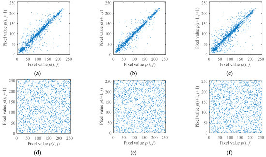 It can be seen from the correlation coefficient comparison table that the correlation coefficient of the three directions of this algorithm is generally slightly lower than that of the reference. Therefore, the proposed algorithm has a better ability to resist statistical analysis attacks. The distributions of adjacent pixels are shown in Figure 9. Among them (a), (b), and (c) are the correlation point diagrams of the original images in three directions, (d), (e), and (f) are the correlation point diagrams of the encrypted images in three directions.