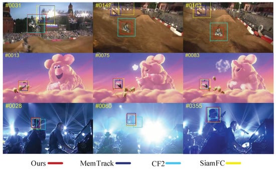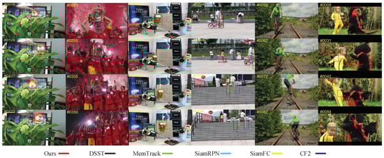 In order to analyze the proposed tracker in more depth, we performed another qualitative analysis. Figure 9 shows the effect comparison of different trackers on six typical video sequences. These trackers include a CF-based tracker DSST, attention-based tracker MemTrack, Siamese-based tracker SiamRPN and SiamFC, CNN’s and CF-based tracker CF2.