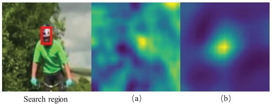 where in the formula represents the cross-correlation operation of two features. The parameter d represents the bias; denotes the method of extracting deep features. The position of the maximum response value of represents the target position.