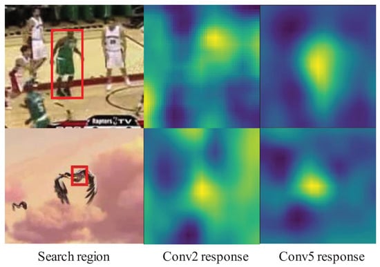 Due to the characteristics of depth features, low-level features contain more target details due to their higher resolution, while high-level features encode more high-level semantic information despite their lower resolution. In the tracking stage, the fusion of high- and low-level features becomes an effective method to solve the problem of positioning accuracy. Therefore, the fusion of high and low-level features has become a research problem. Figure 4 contains two video sequences, showing the response values of different feature layers on the same video frame. Obviously, different feature layers contribute differently to the target response.