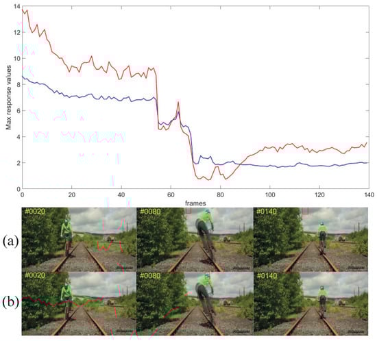Figure 6 compares the responses of the same video sequence with different frames before and after using adaptive hierarchical deep features. We can clearly see that, in the video, when the appearance and position of the biker significantly changed, the tracking failed without the use of adaptive hierarchical deep features; at this time, the tracking box appeared in the same position and the response value was approximately the same. When using adaptive hierarchical deep features, although the response value drops sharply as the biker’s appearance and position changes, the tracking can still be completed, and it gradually returns to normal and remains in the subsequent frames.