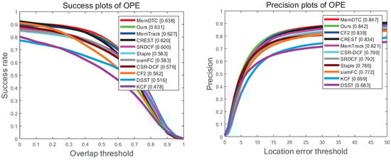 As shown in Figure 7, on the OTB100 dataset, our tracker achieved excellent results in terms of both success rate and precision rate, with a success rate of 63.1% and an precision rate of 84.2%, which are 4.8% and 7.0% better than the baseline algorithm SiamFC, respectively. Compared with the attention Siamese tracker MemTrack, our tracker was 0.4% and 3.1% ahead in success rate and precision rate, respectively. However, compared to the attention memory tracker MemDTC, our tracker lagged behind in success rate and precision rate by 0.7% and 0.5%, which we speculate is due to the dynamic memory network introduced by MenDTC, which enables the target template to adapt to changes in target appearance during tracking. We also compared some CNN- and correlation-filter-based trackers such as SRDCF, CREST, CSR-DCF. The proposed tracker achieved a 3.1%, 1.1%, and 5.2% improvement in success rate and 5.0%, 0.8%, and 4.3% improvement in precision rate compared to these methods.