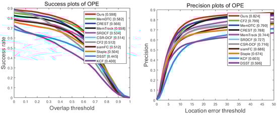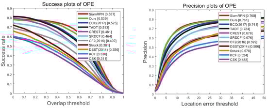 The OTB dataset is a public dataset to test the effectiveness of target-tracking algorithms, which is divided into OTB50 [] and OTB100 [], containing 50 and 100 video sequences, respectively.