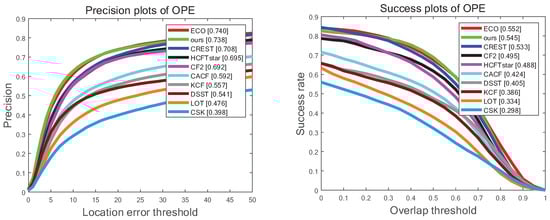 The UAV-123 [] is a dataset consisting of low-altitude UAV capture videos, which is fundamentally different from the videos in mainstream tracking datasets, such as OTB50, VOT2014. It contains a total of 123 video sequences and over 110k frames. Unmanned aerial vehicles (UAVs) are increasingly used in daily life, so it is of practical significance to test the proposed algorithm on this dataset. We tested our algorithm on UAV123, using the same evaluation method as the OTB dataset, against nine other algorithms, including: SRDCF [], CREST [], CF2 [], SiamRPN [], DSST [], Struck [], ECO [], TADT [], KCF [], and CSK [], the comparison results are shown in Figure 11.